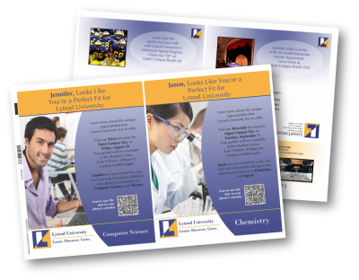 Deciding on the right college is a stressful time and it is made even worse when prospective colleges use information overload. With VDP you can stand out by only providing information relevant to each individual student. The recruitment flyer and tour invitation uses stunning imagery to showcase the incoming student’s intended major and interests. It provides a personal invitation to events that were scheduled just for them, leading to greater event attendance.